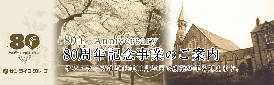 サン・ライフグループは、皆様のおかげで80周年を迎えることができました。 80周年を迎えるにあたり、90周年、100周年と、お客様にご信頼頂ける存在になるべく一層努力してまいることをコンセプトとして定めました。 |